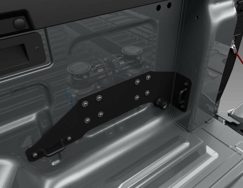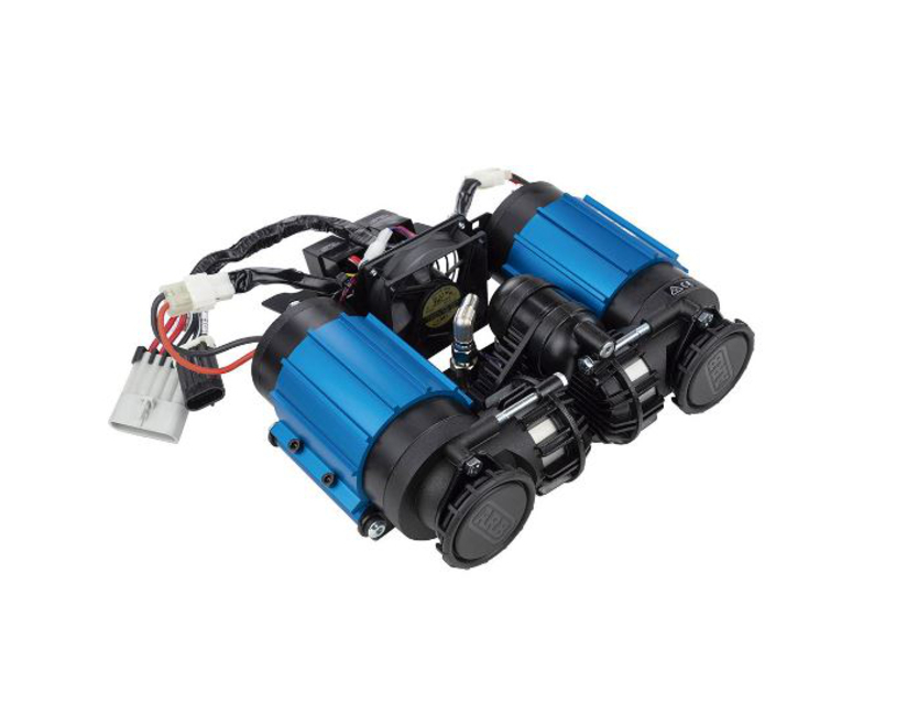 Komplet zračnega kompresorja z dvojnim motorjem je zasnovan za vgradnjo na vozilo, za desnim zadnjim kolesnim lokom. Zagotavlja zrak na zahtevo, kadar koli, iz zračne sklopke, ki je lepo nameščena na notranji strani tovorne postelje. Zračni kompresor je izdelan iz lahkih in visoko trdnih materialov za tiho delovanje in podaljšano vzdržljivost. Ima vodilno stopnjo pretoka zraka v razredu in je bil zasnovan za hitro napihovanje. Komplet vsebuje zračni kompresor, pritrdilni nosilec, kabelske snope, stikalo kompresorja, visokotlačno cev in vso potrebno opremo.