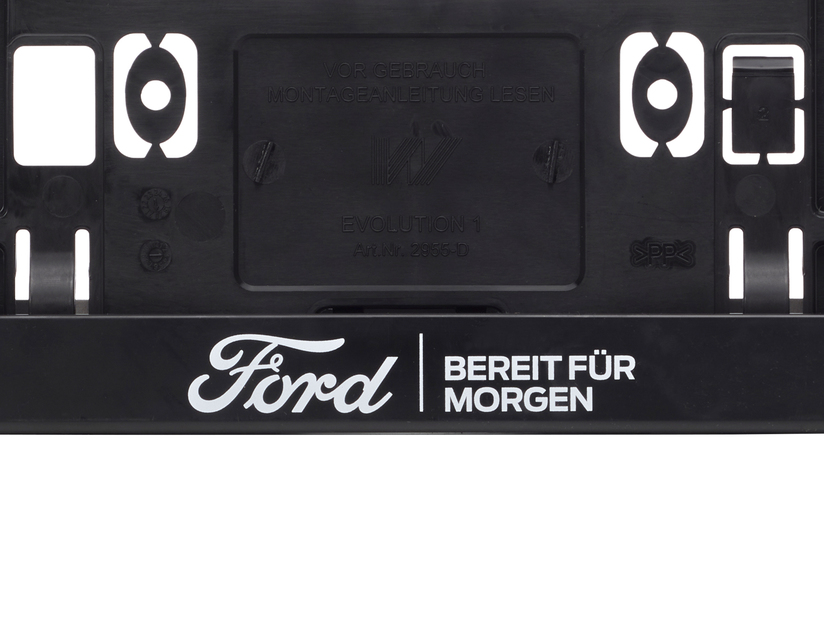 Držalo Ford EČV črne barve, z modrim logotipom Ford in belim logotipom “Eine Idee weiter”.