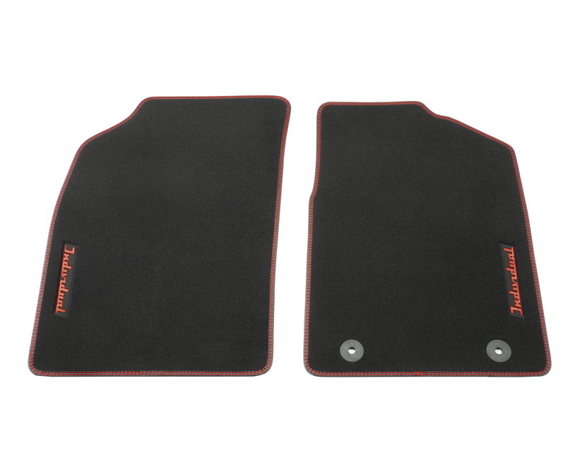 Spredaj talne preproge iz velura, črne barve z rdečimi dvojnimi šivi